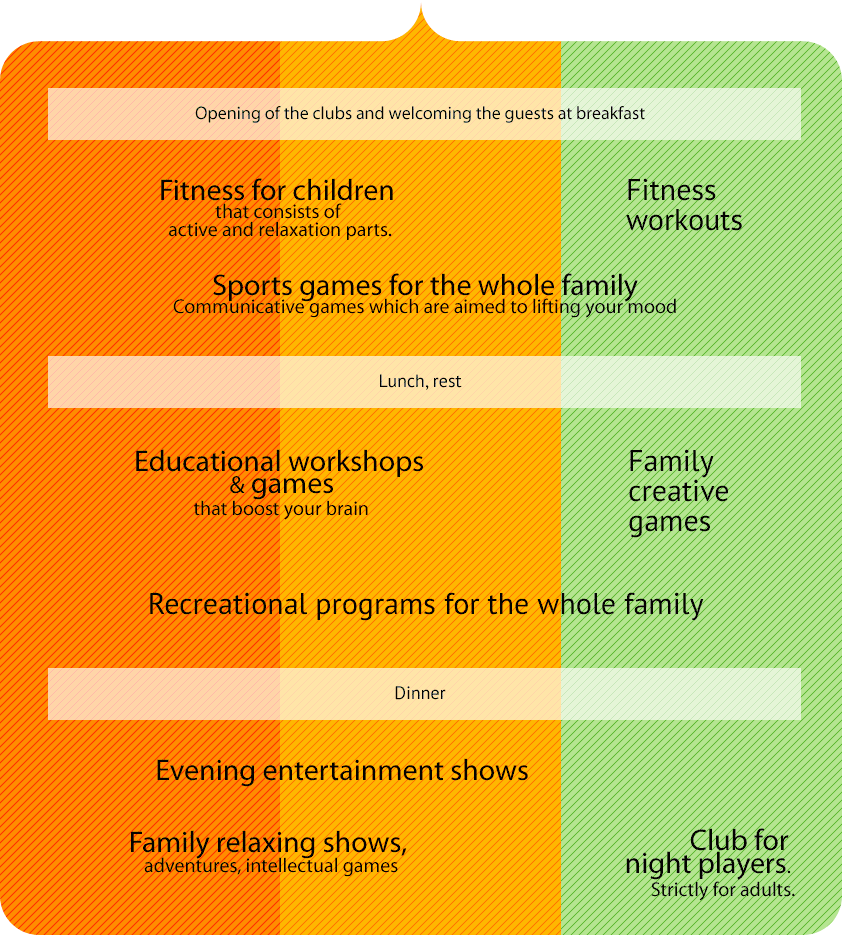 Наша цель сделать отдых вашей семьи увлекательным и интересным. В течение дня вас ожидают семейные развлечения, представления и конкурсы в рамках активной анимации TURBO GAMES.